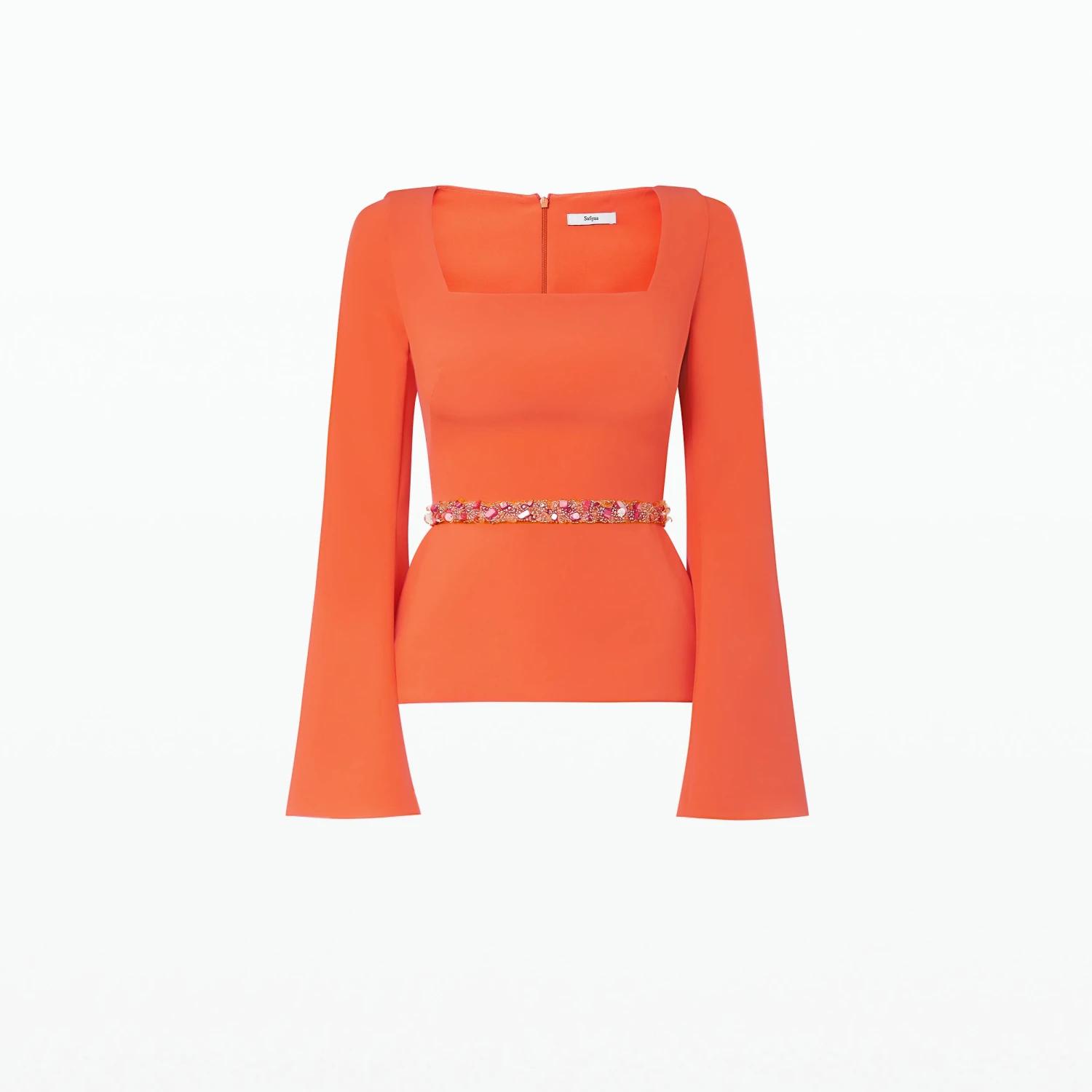 Bell sleeved top with square neckline in amber sun Heavy Crepe with reef Shore Trim embroidery.