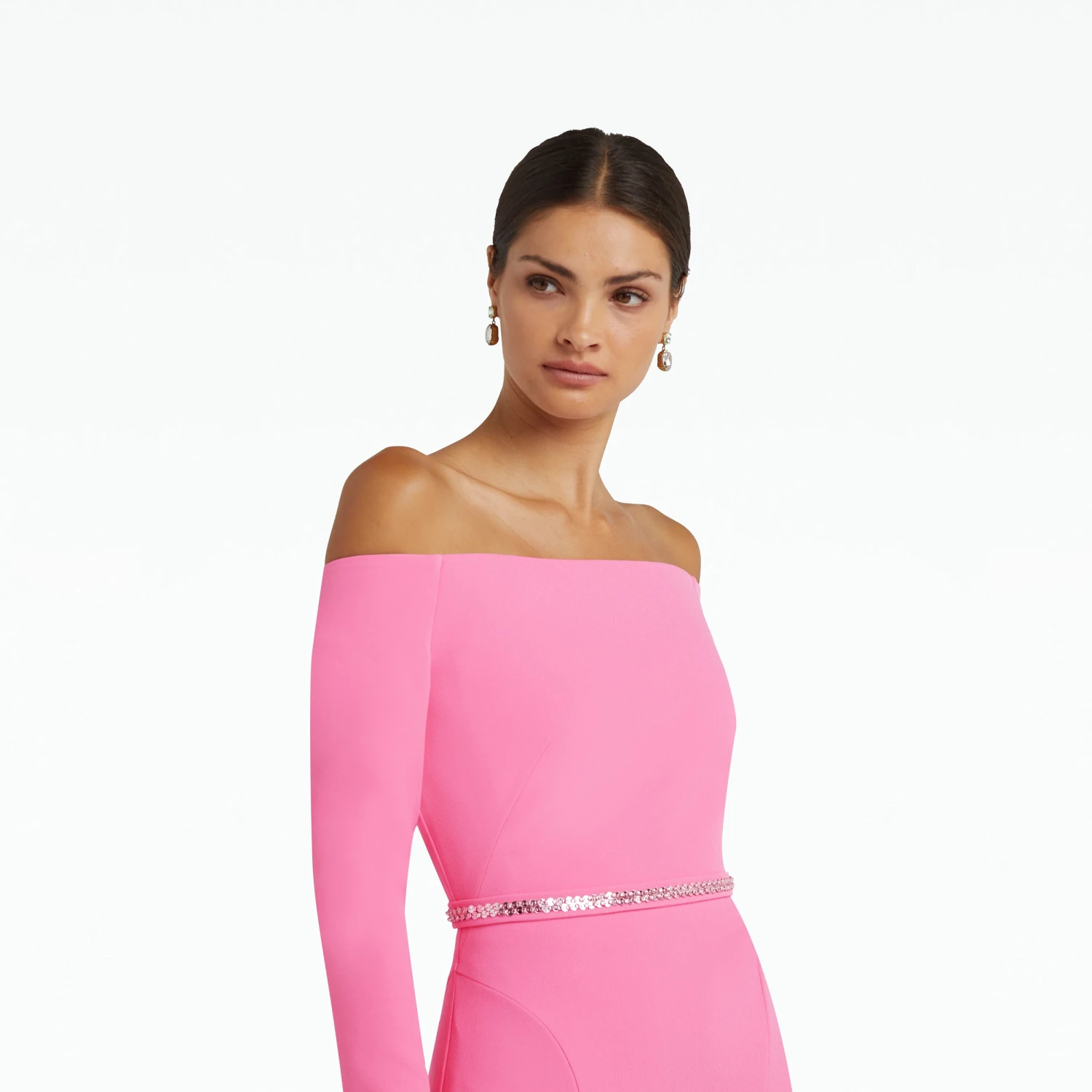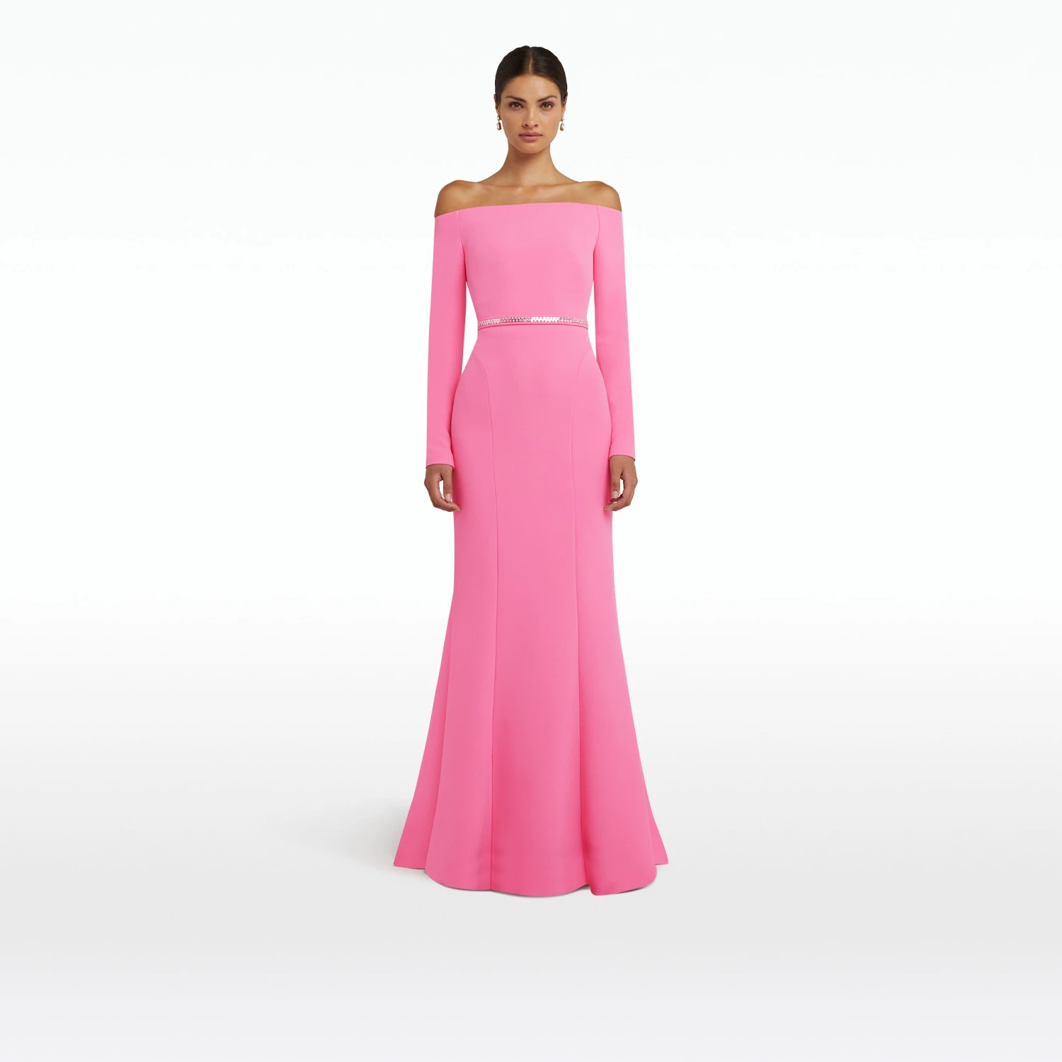 Fishtail gown with off the shoulder, straight neckline and flattering skirt seam lines in aurora Heavy Crepe with crystal Mirror Disc embroidery.