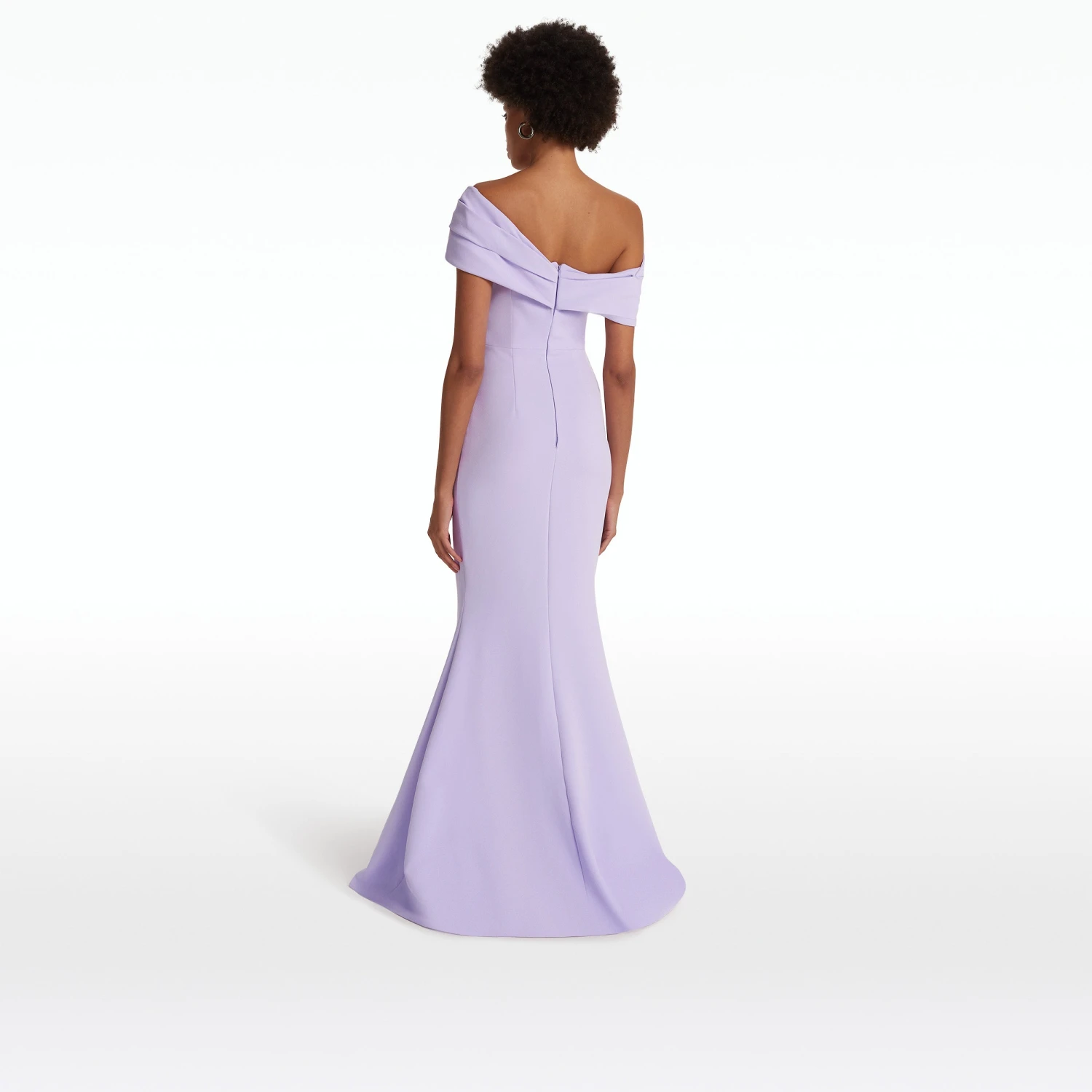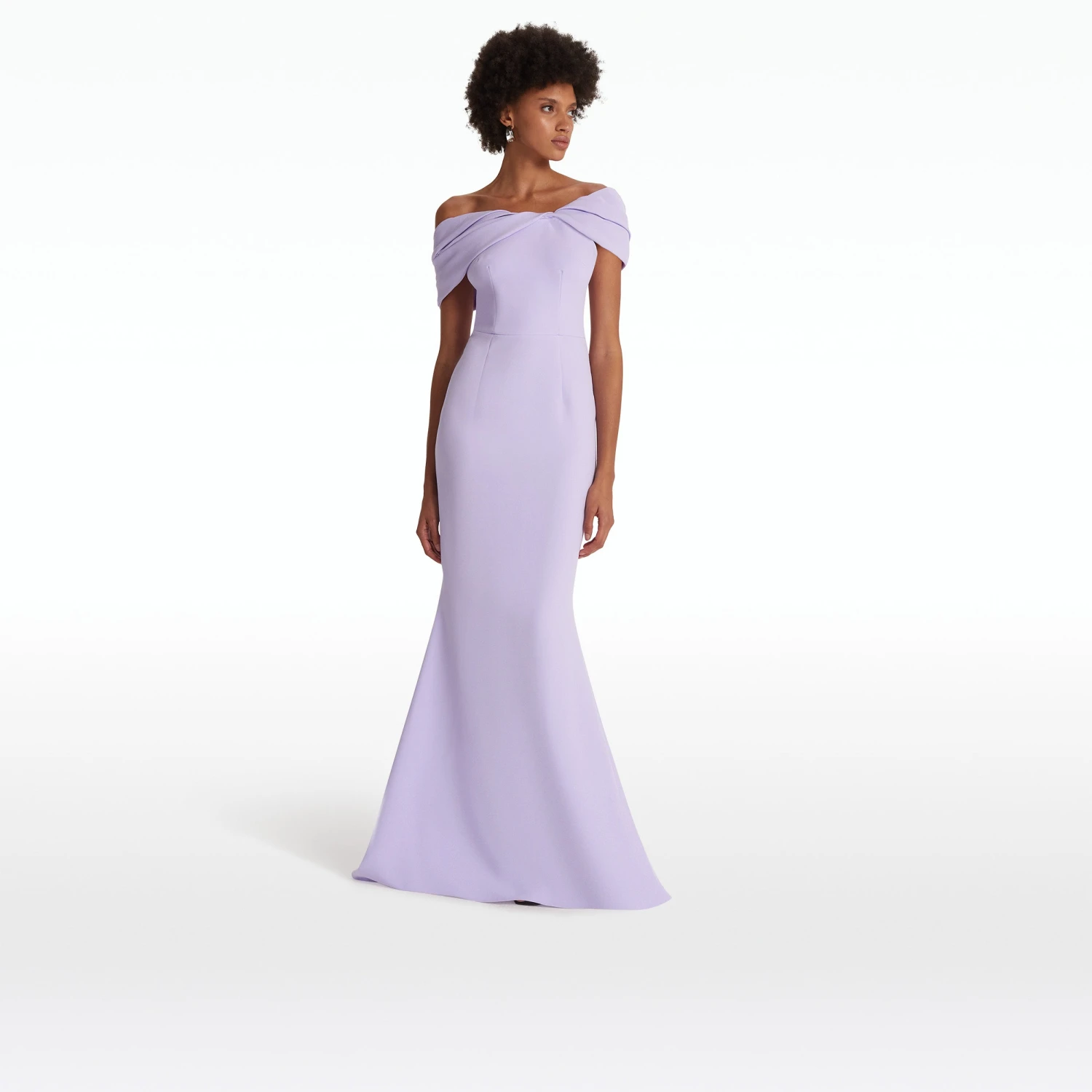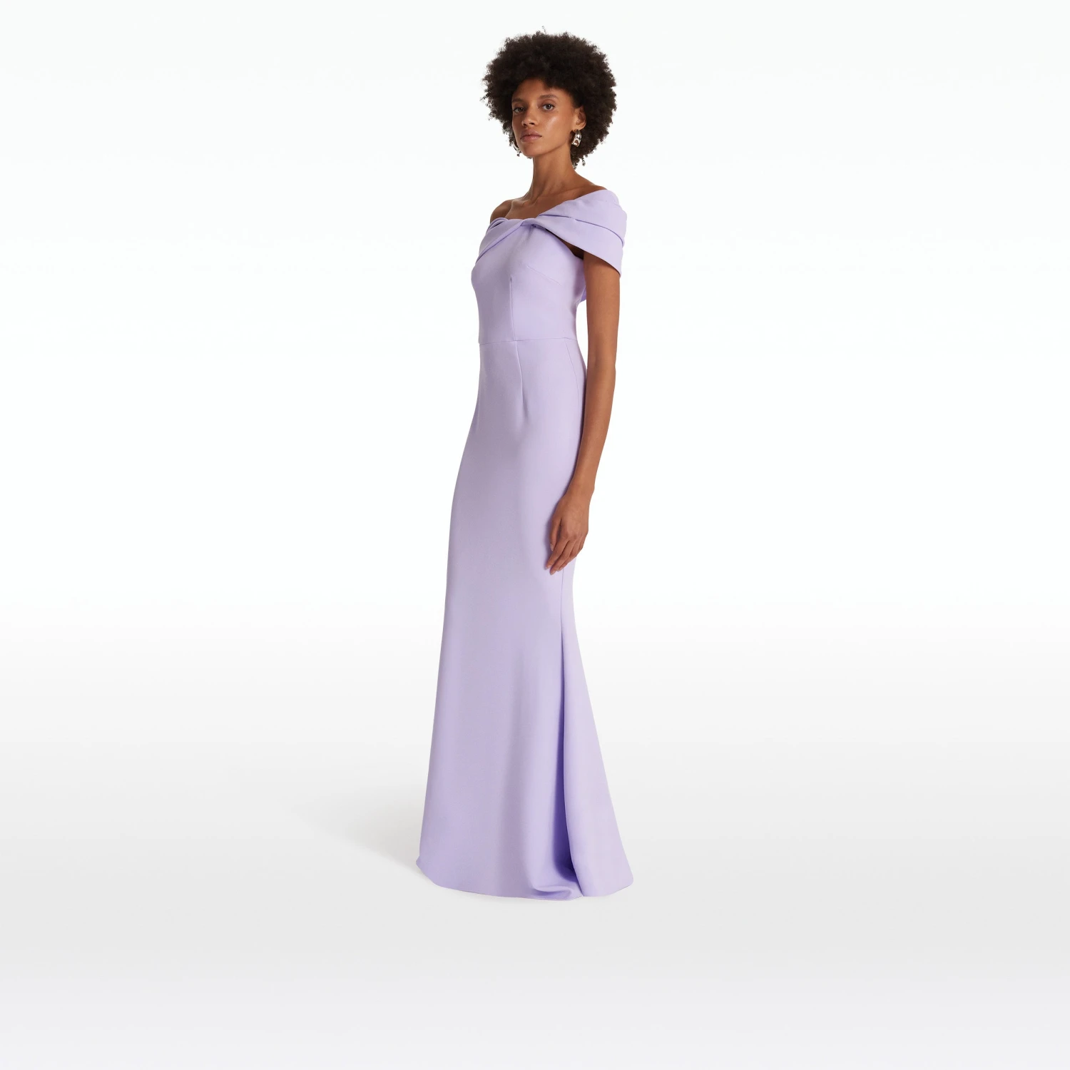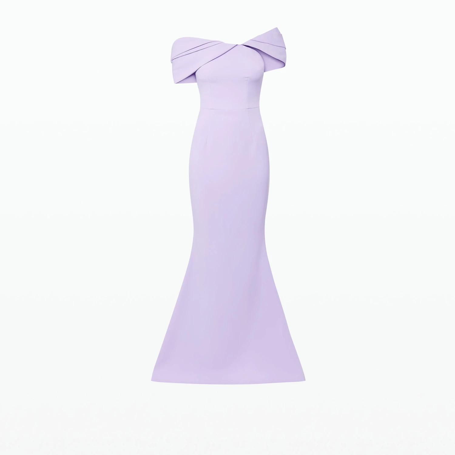 Off-shoulder dress with asymmetric shoulder drape in verbena Heavy Crepe.