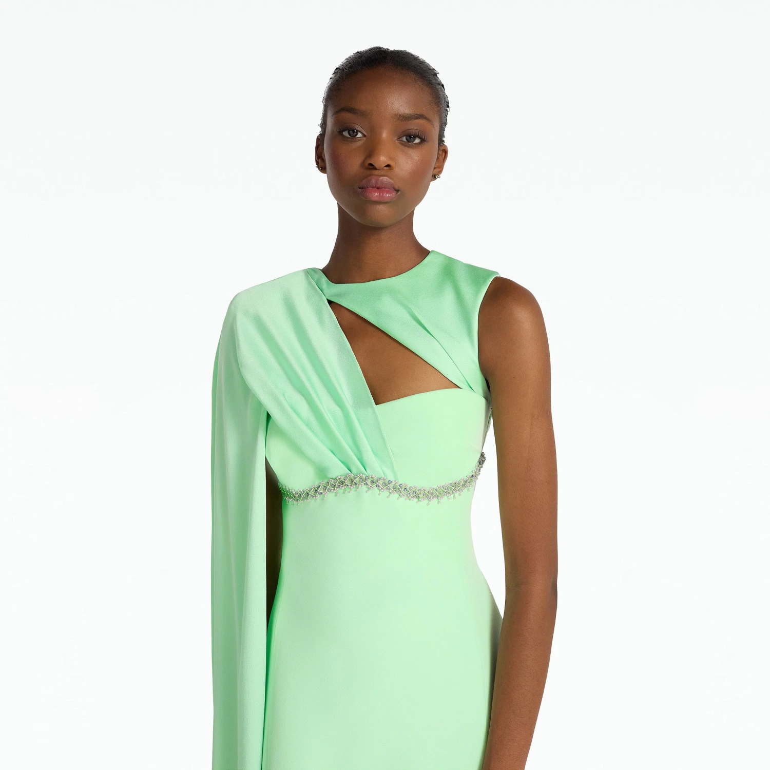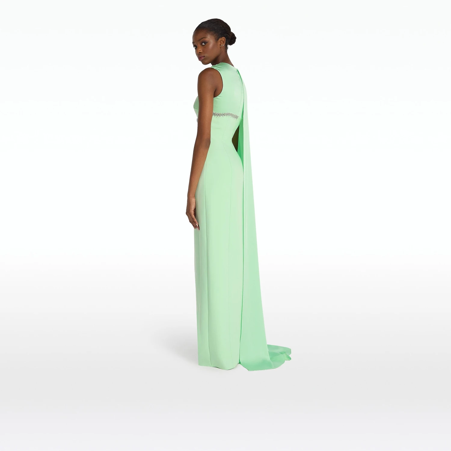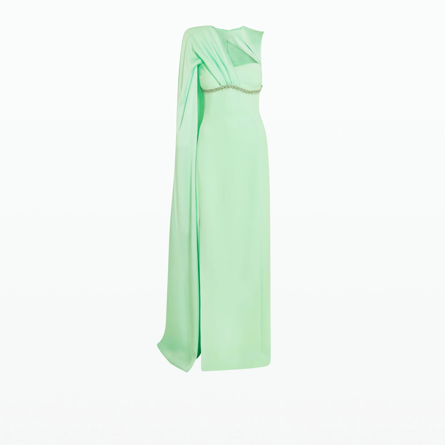 Column gown with sculpted neckline and statement contrast caped sleeve in brook green Heavy Crepe and Satin Back Crepe, with Geometrica embroidery.
