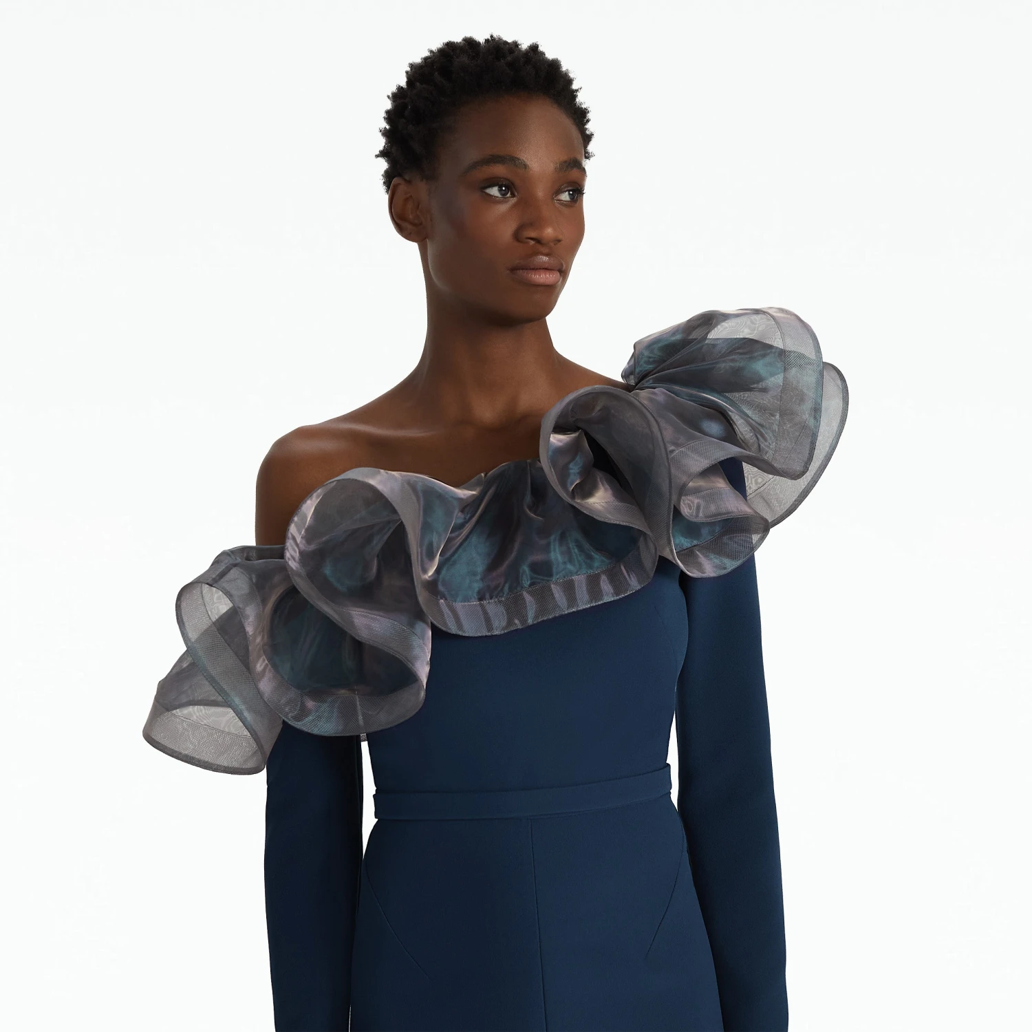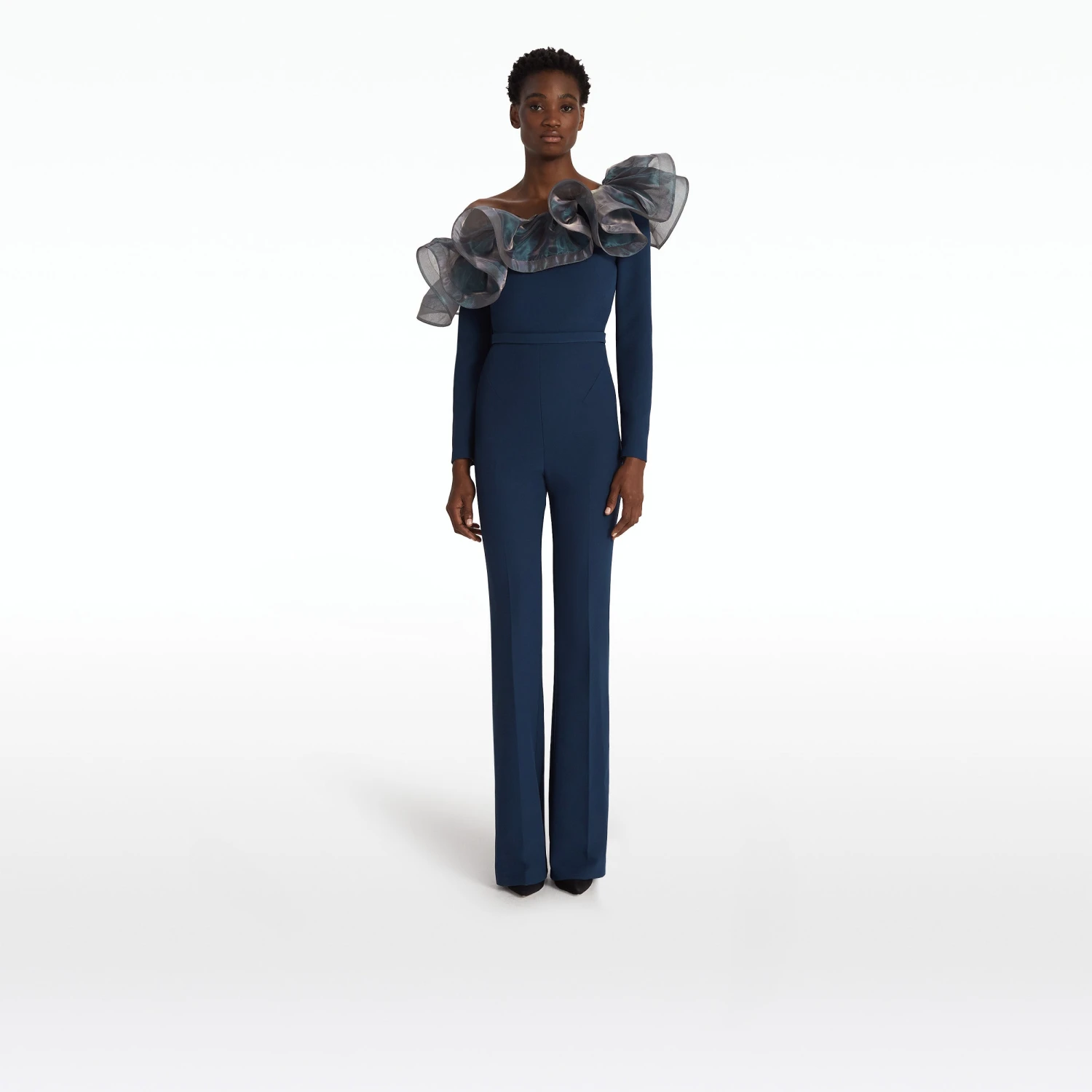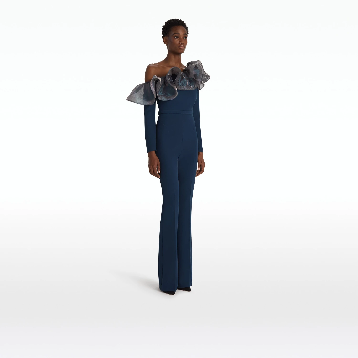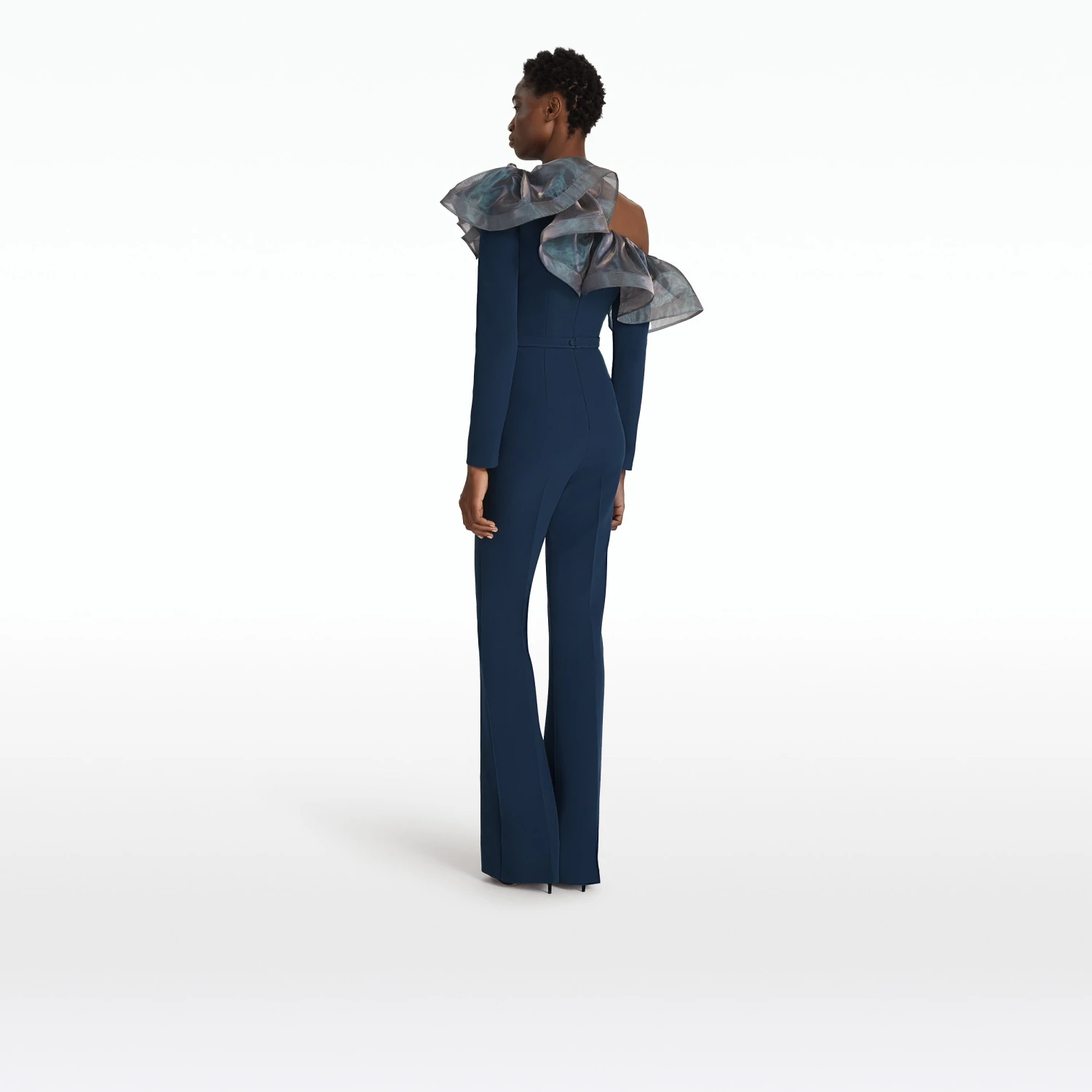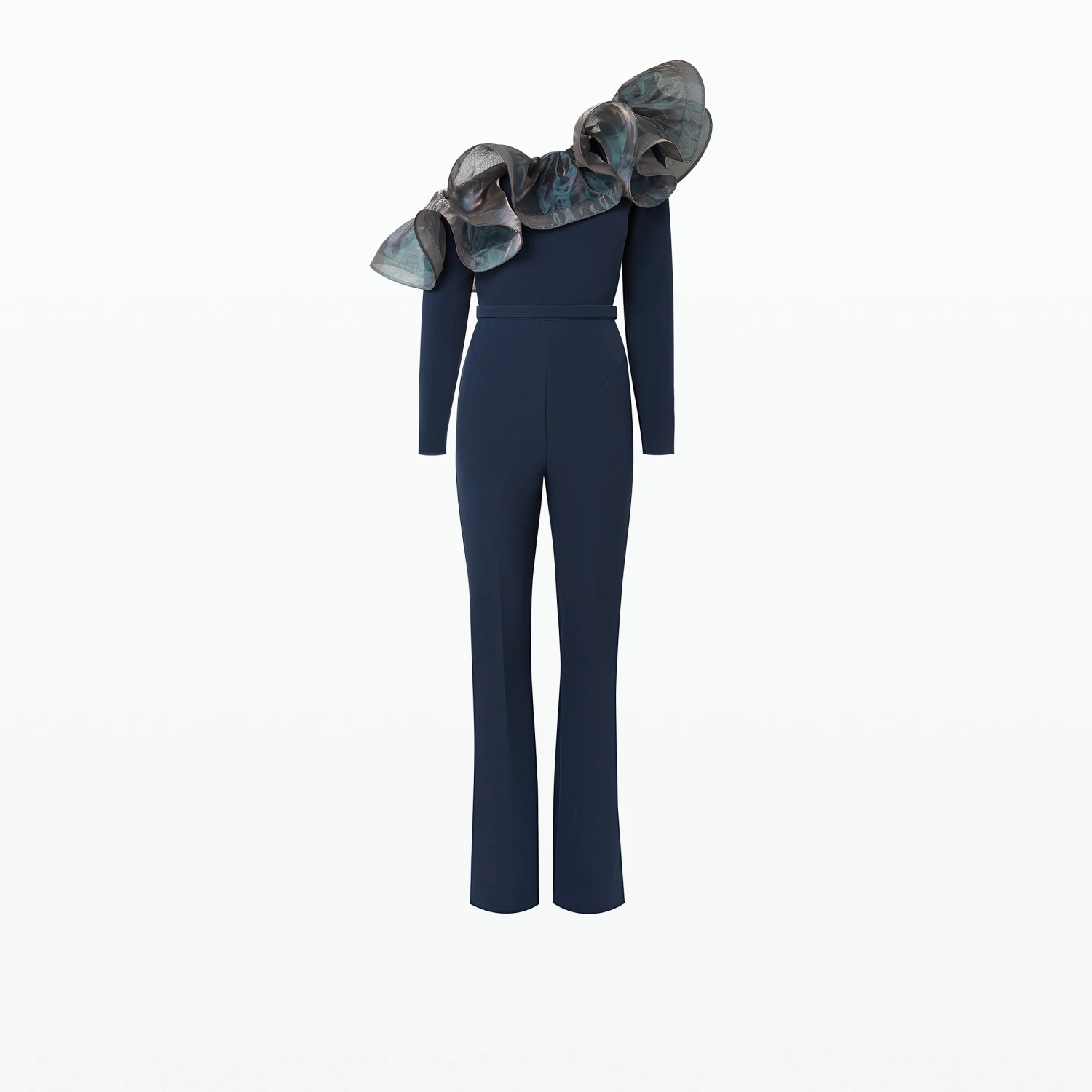 Semi-flare legged jumpsuit with cascading drape in moonlit ocean Heavy Crepe and Mirror Organza.