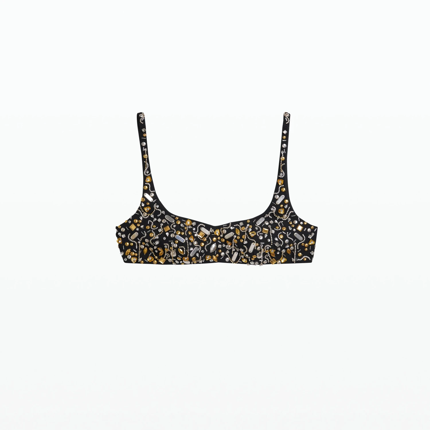 Sweetheart neckline bra in black Heavy Crepe with silver/gold Celestial Scatter embroidery.