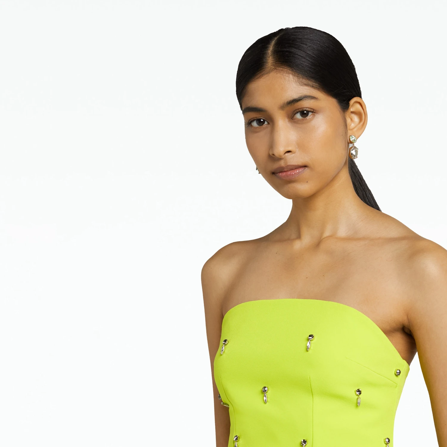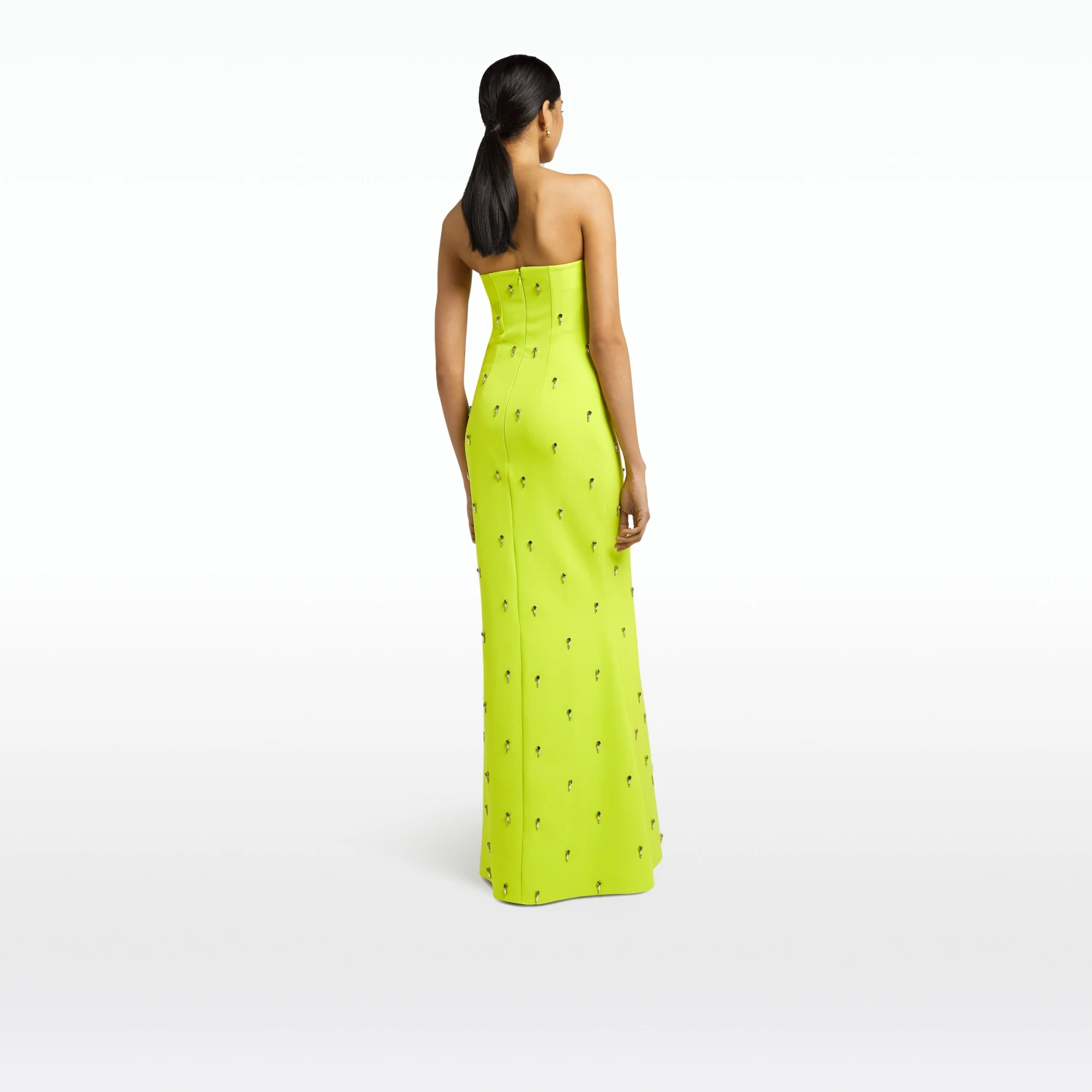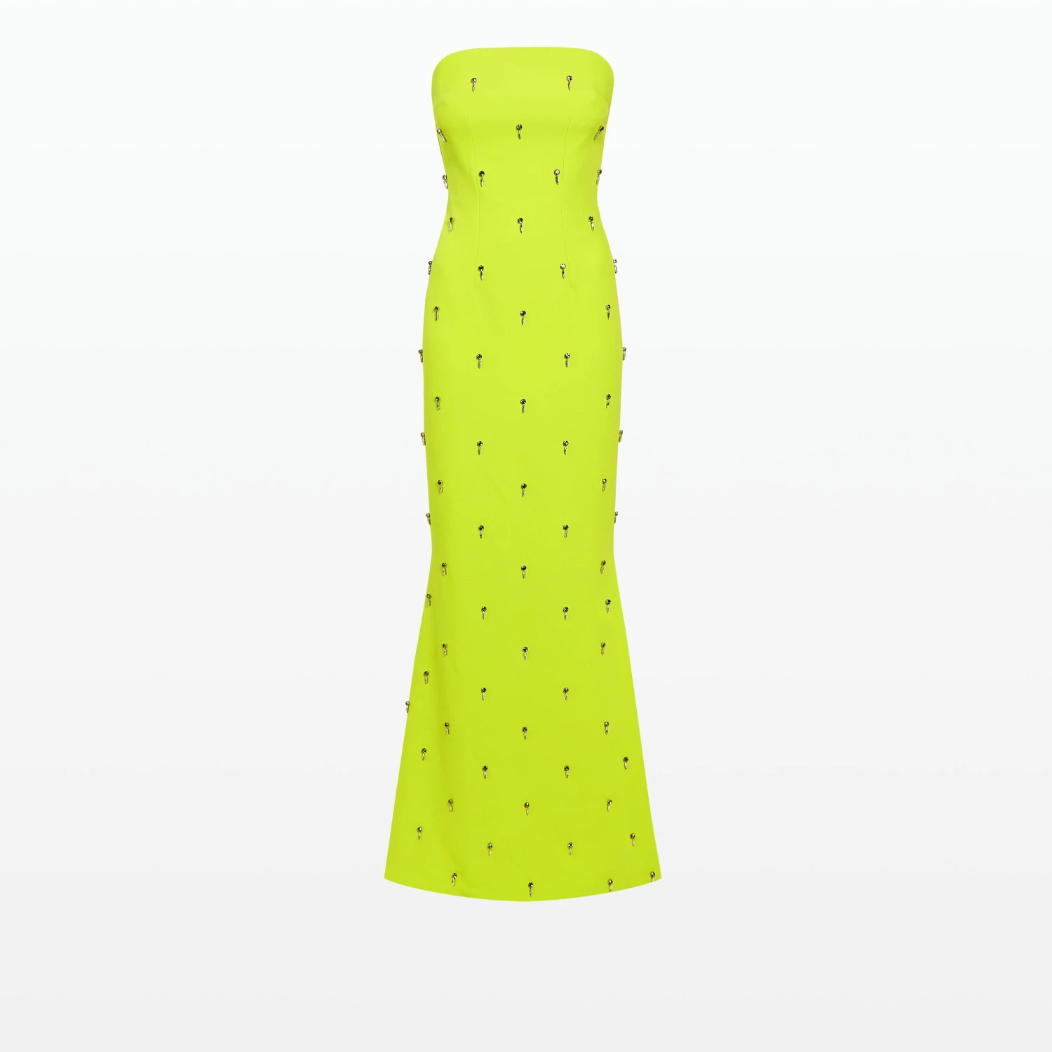 Strapless long dress with fishtail skirt in tendershoots and smoke/crystal Crystal Grid embroidery.