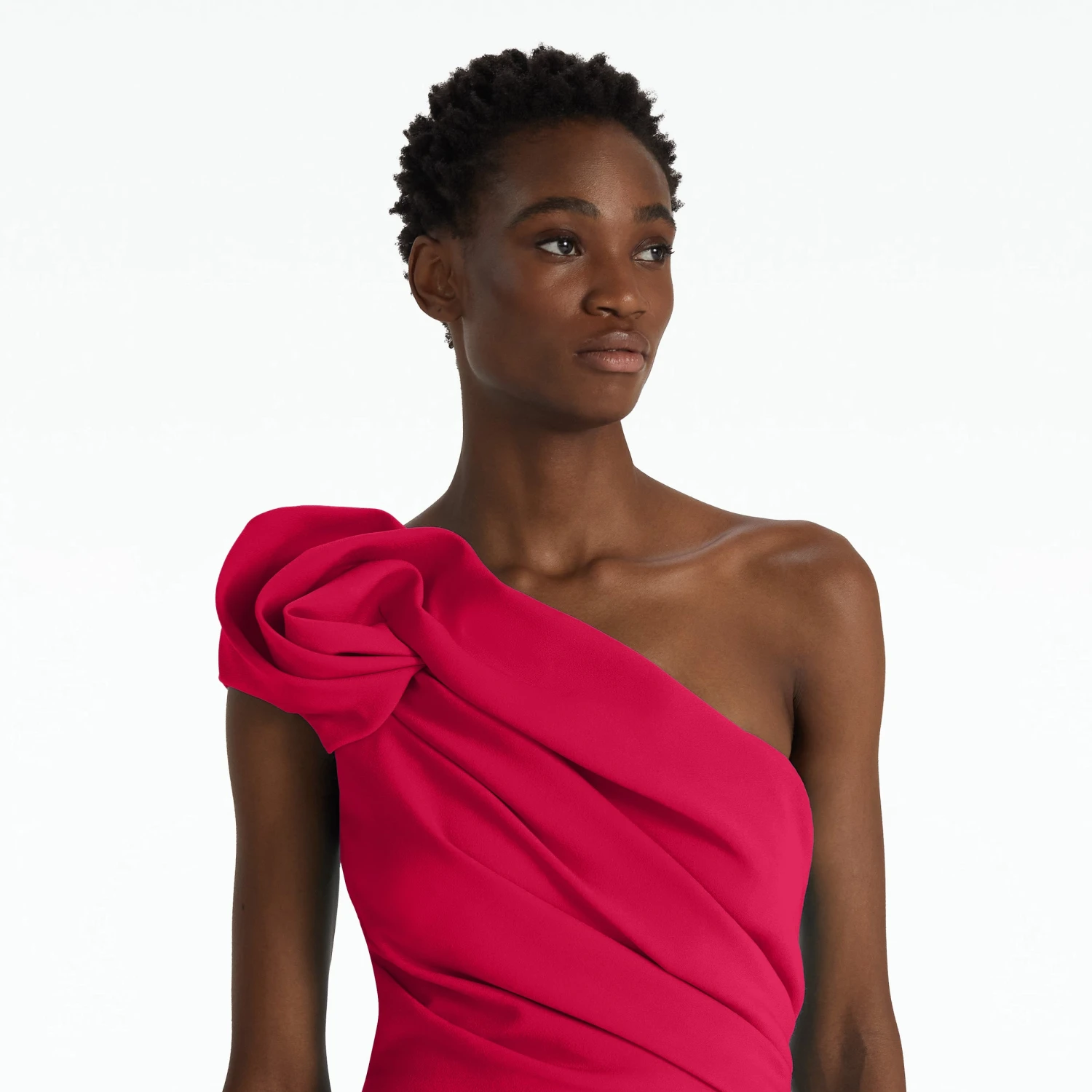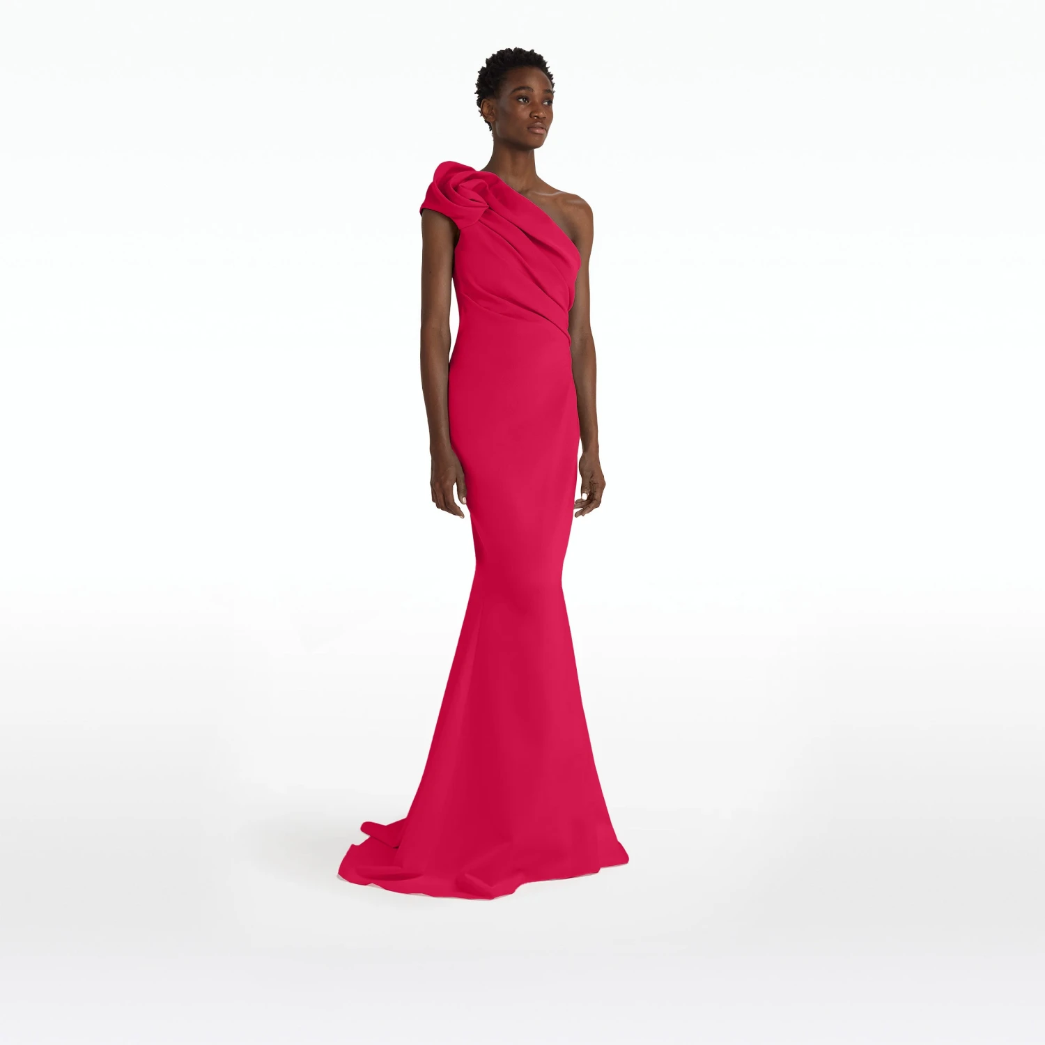 Fishtail gown with pleated bodice drape in raspberry Heavy Crepe.