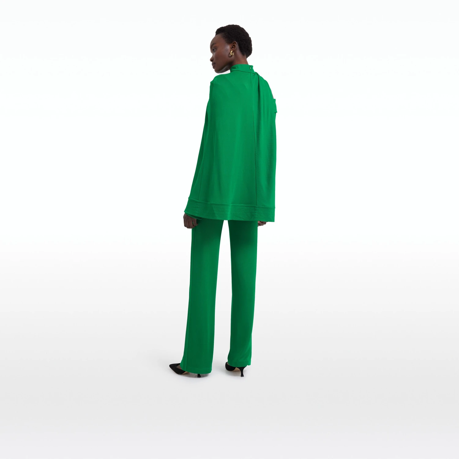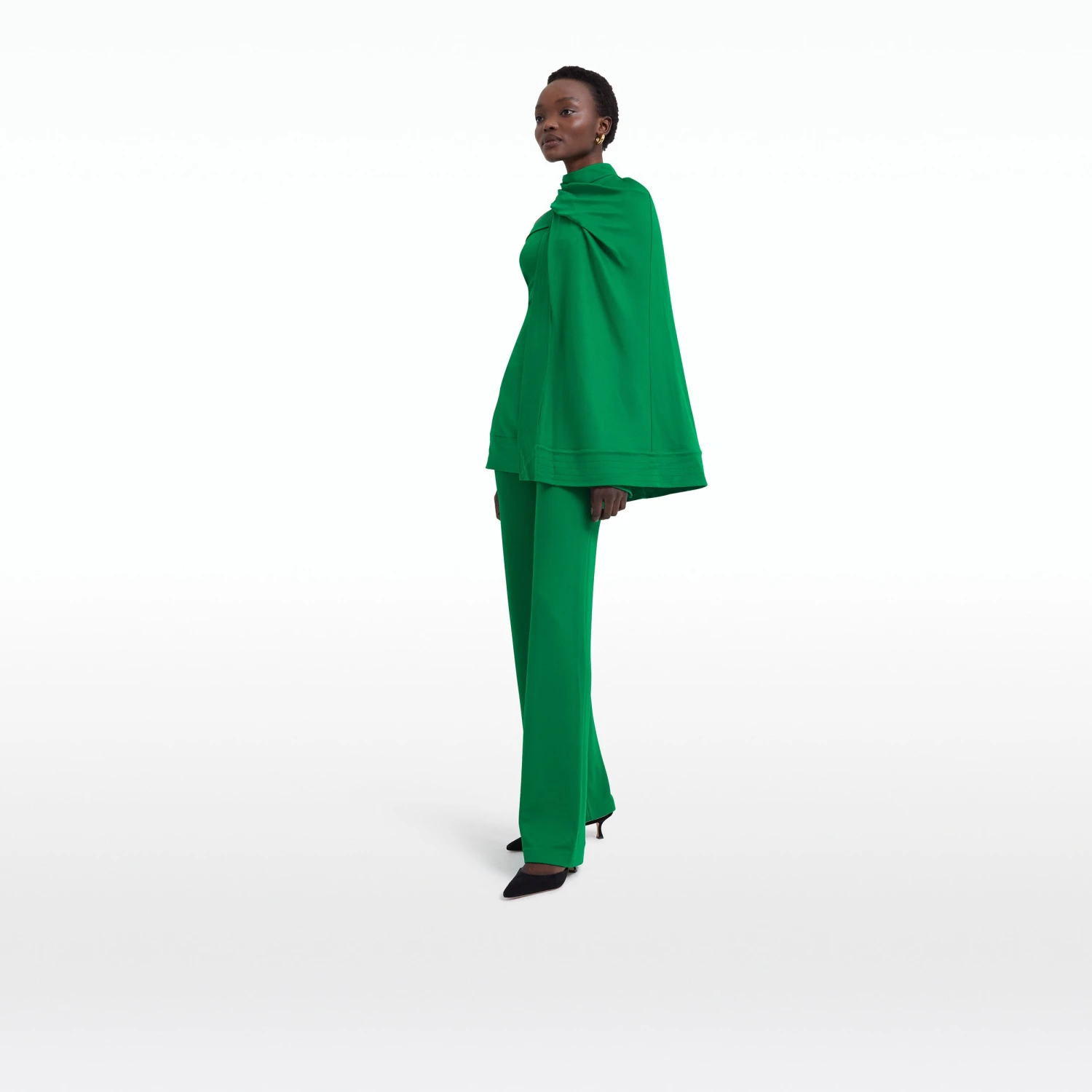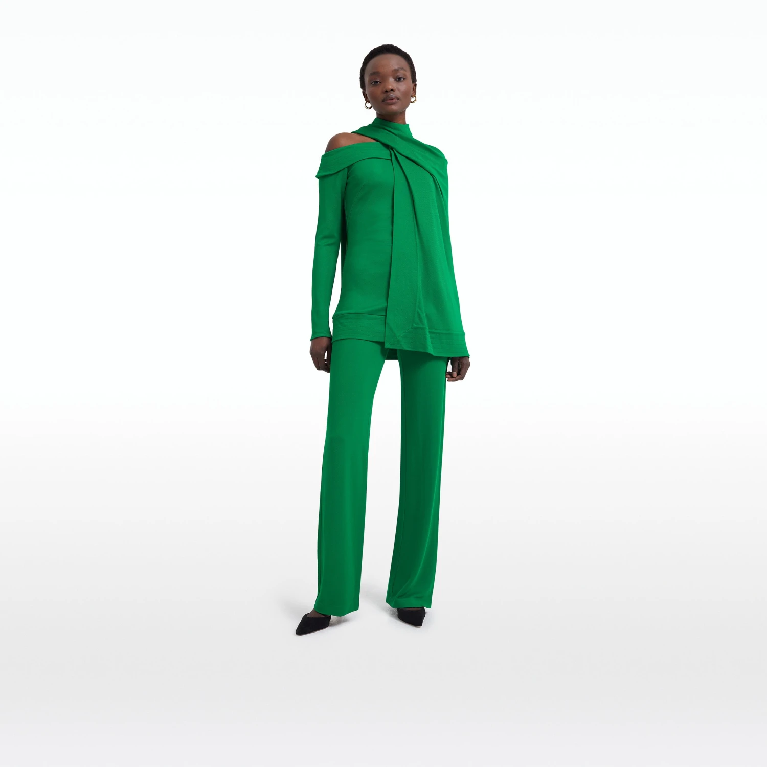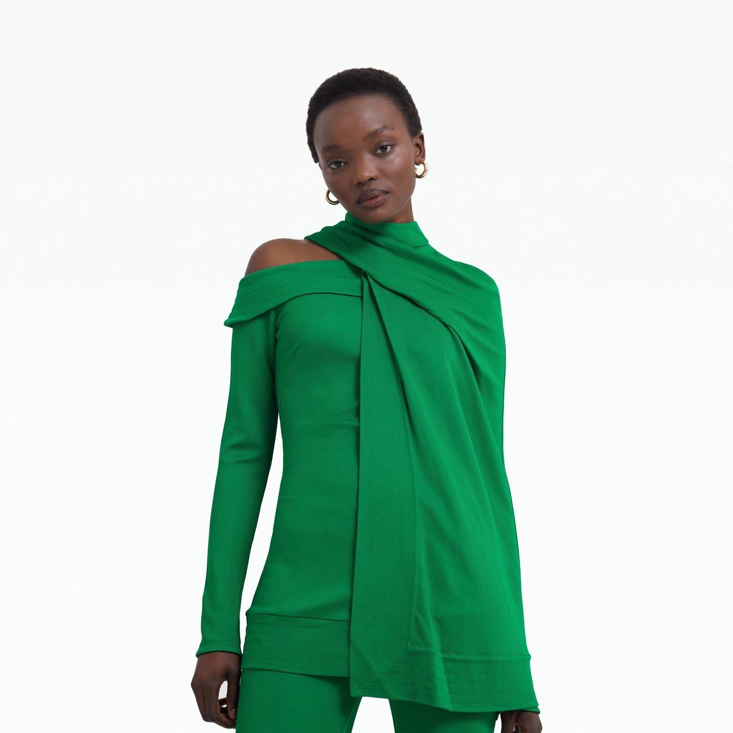 Asymmetric, loose fit top with cold shoulder and semi shawl drape in jewel green.