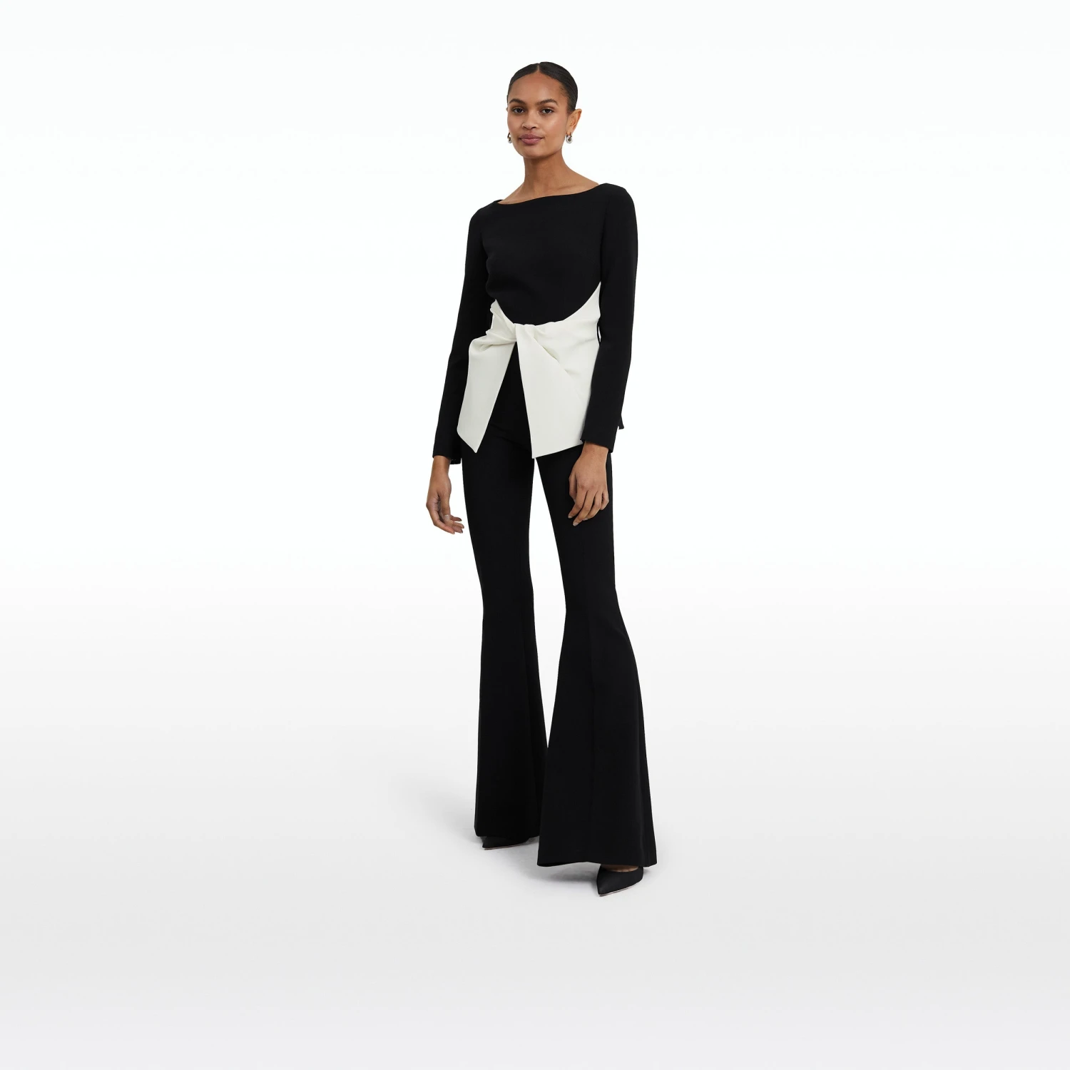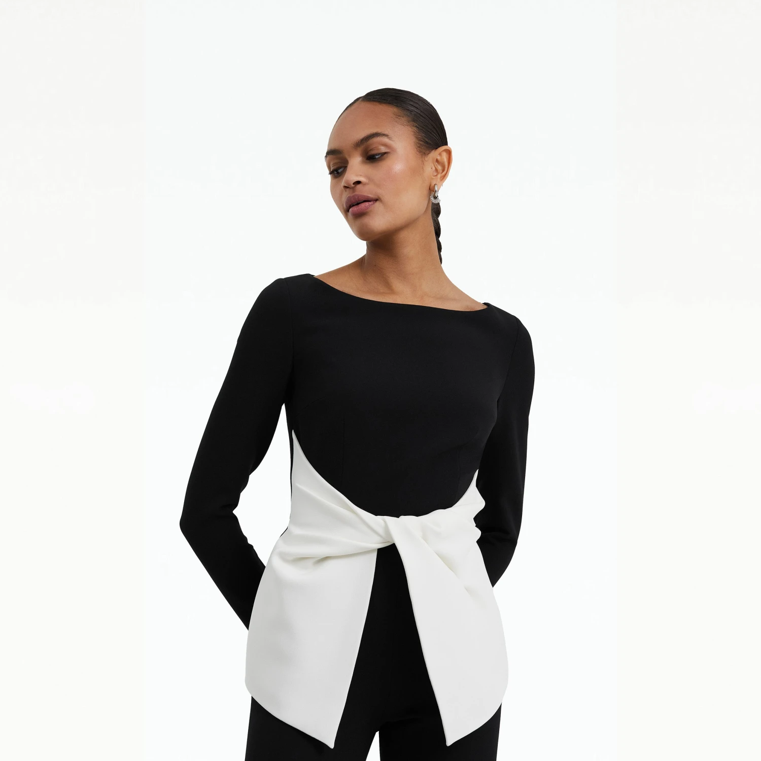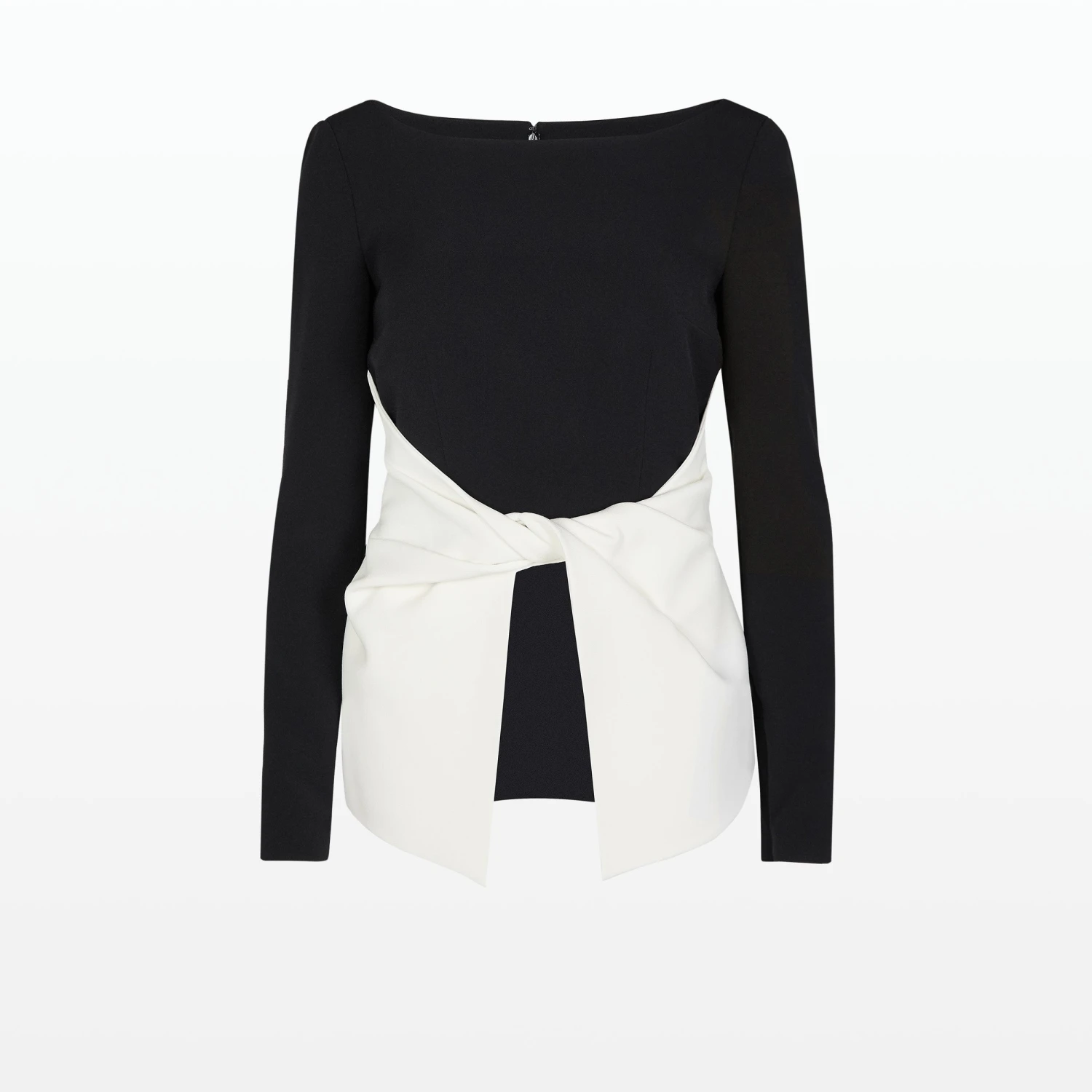 Boat neck, long sleeve top with origami drape in black and ivory.