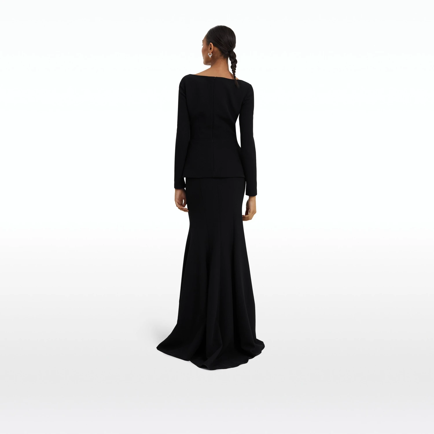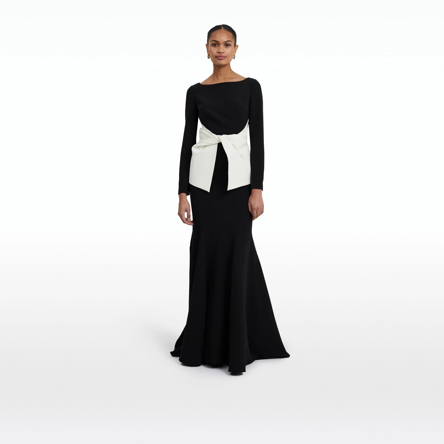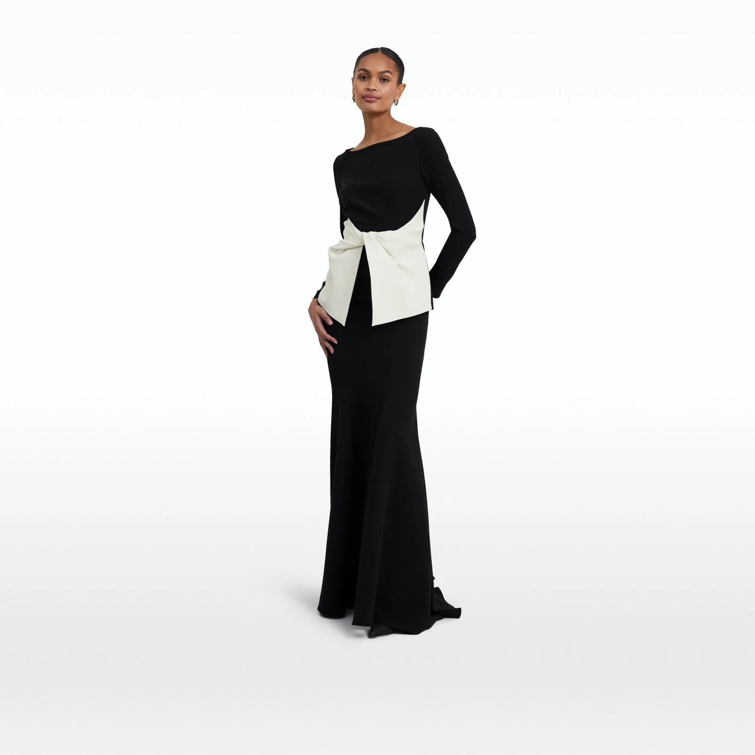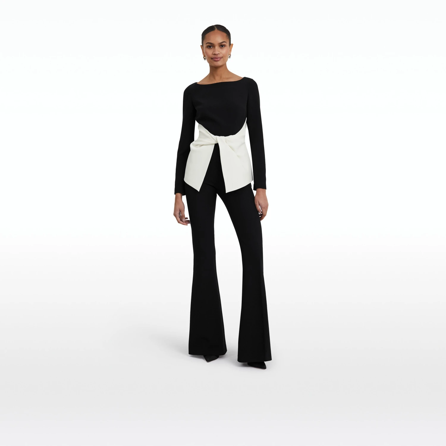 Boat neck, long sleeve top with origami drape in black and ivory.