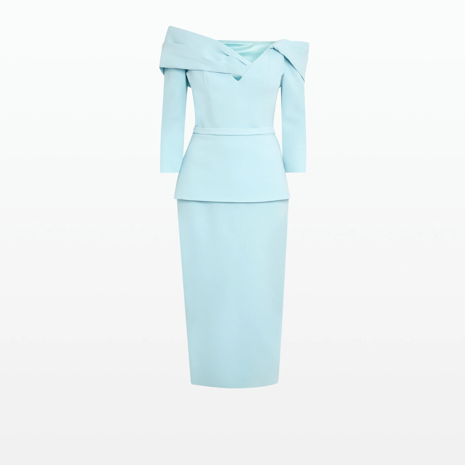 Flattering cocktail dress with peplum and considered bust drape in baby blue Heavy Crepe.