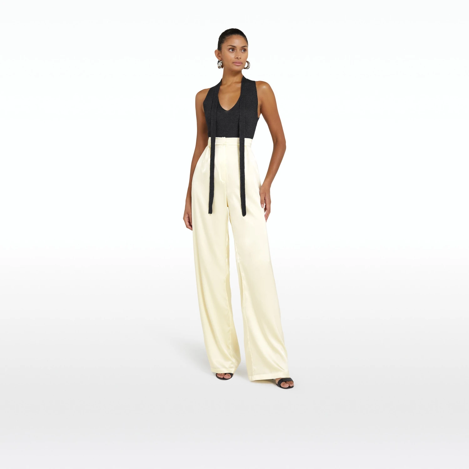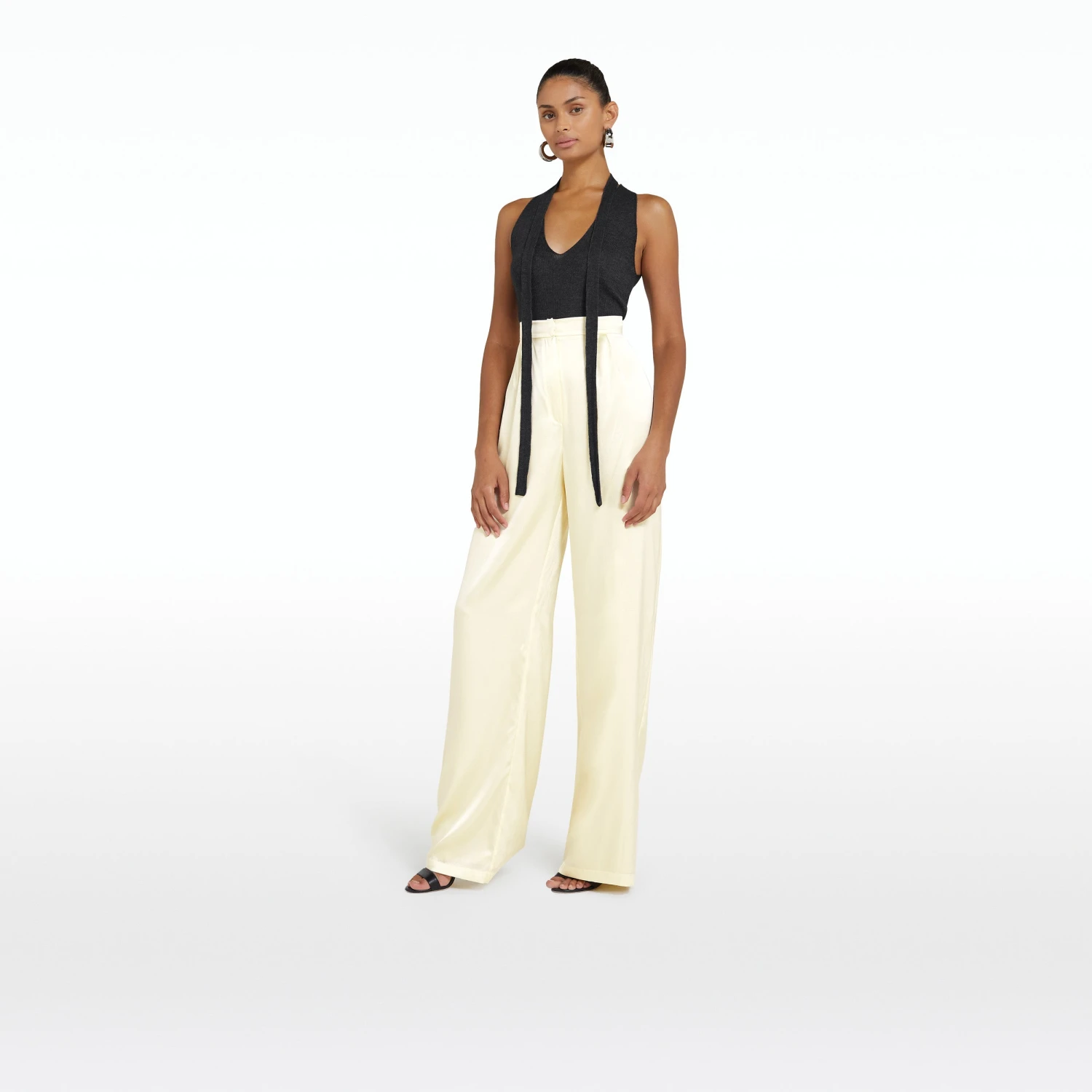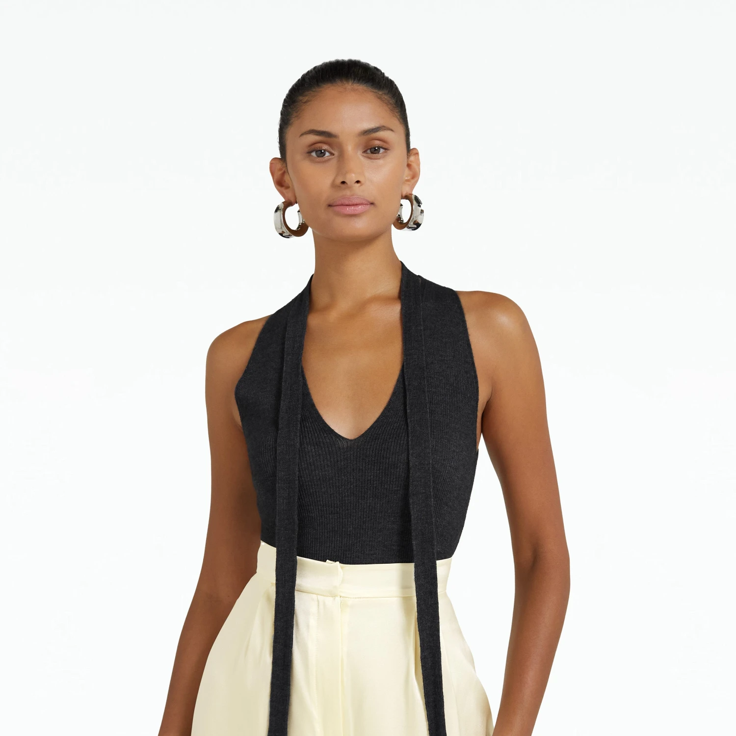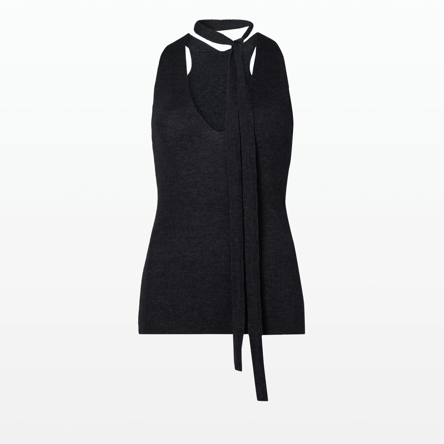 V neck, sleeveless top with neck tie in grey melange.