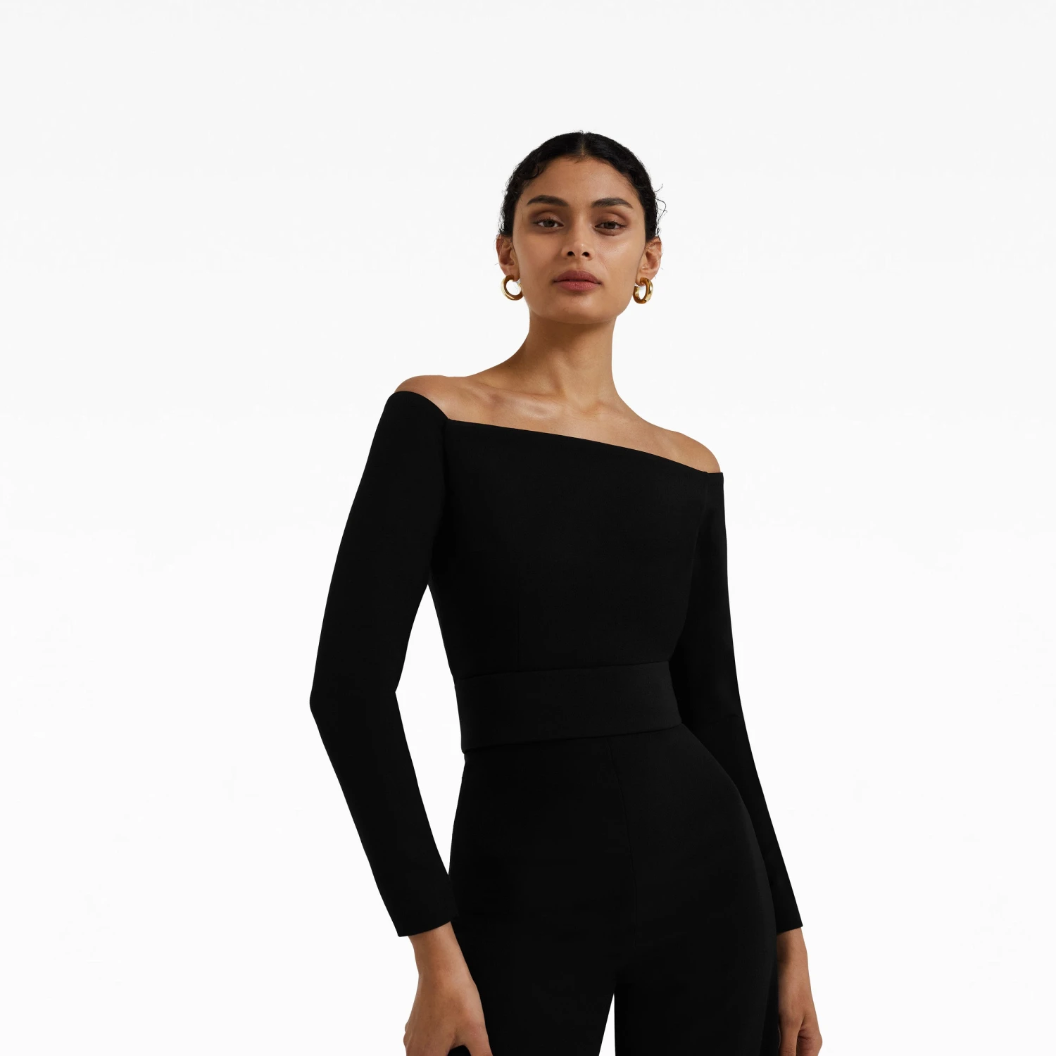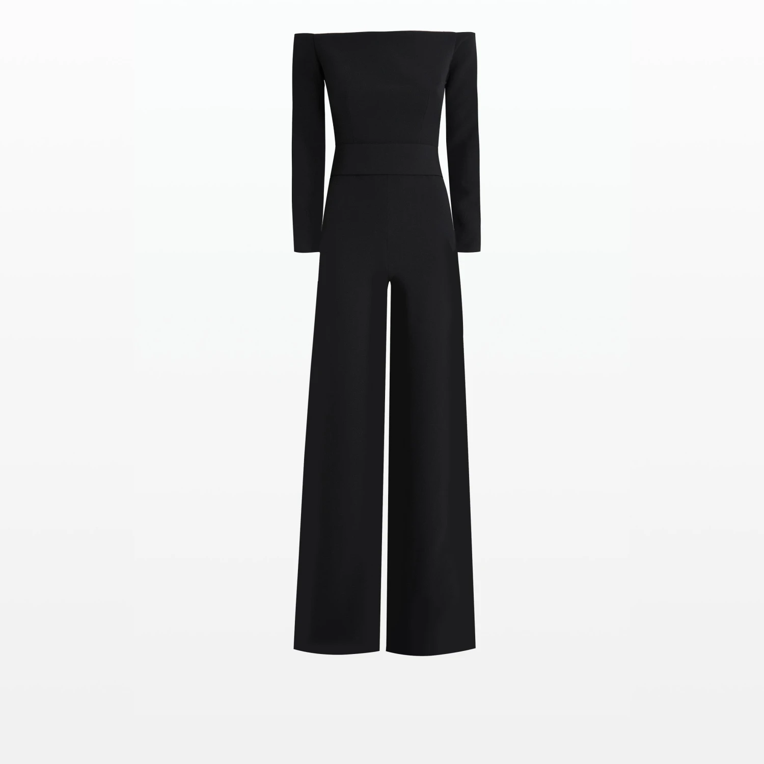 Long sleeved, off the shoulder, wide leg jumpsuit in black Heavy Crepe.