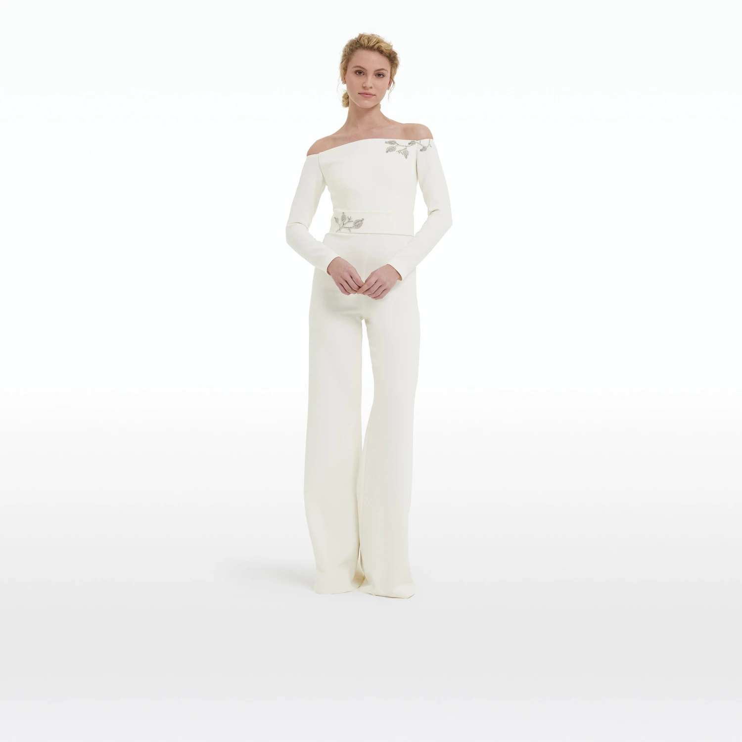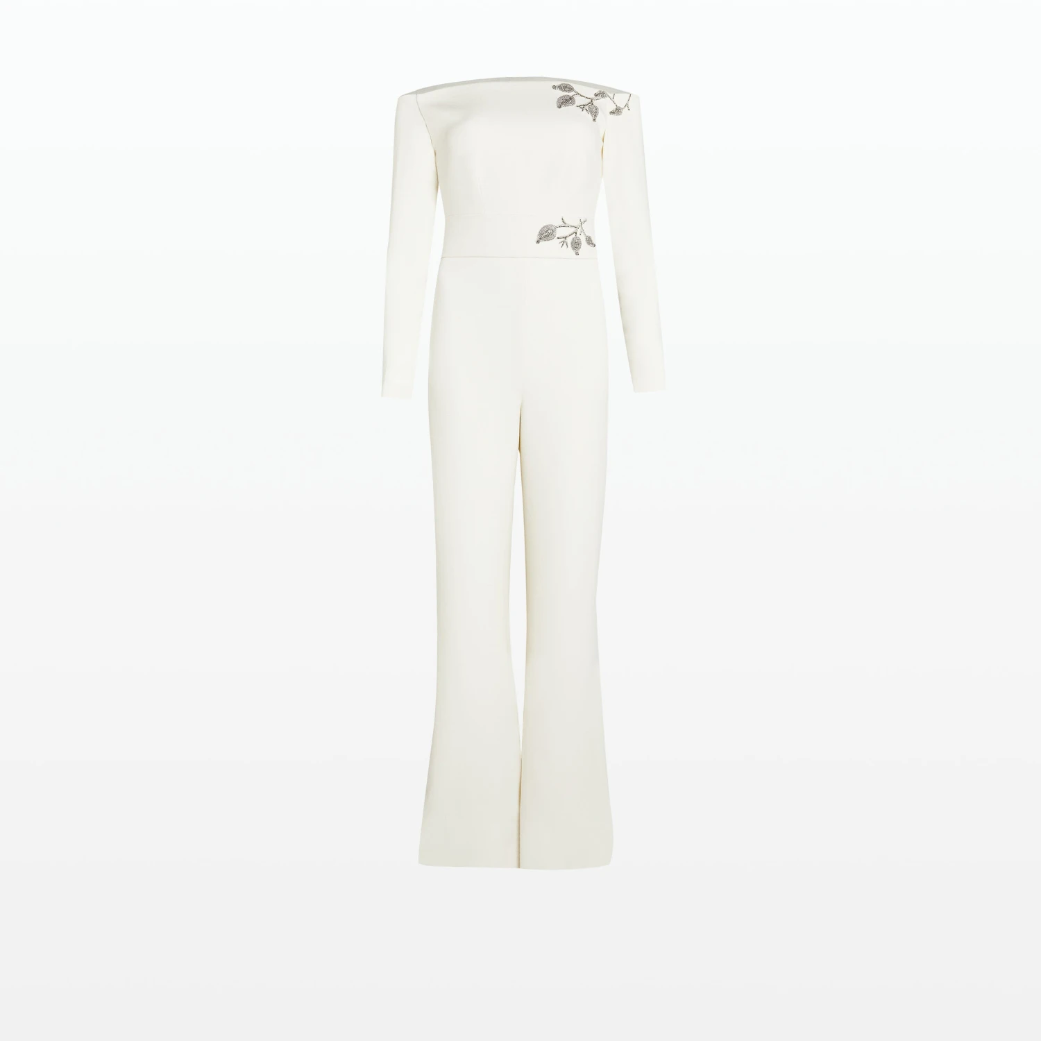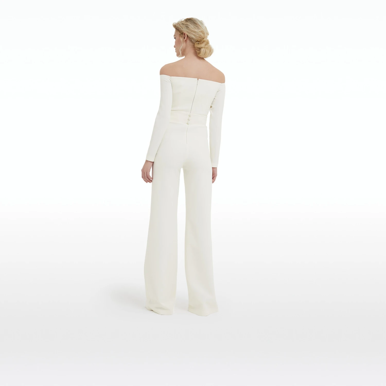 Long sleeved, off the shoulder, wide leg jumpsuit in ivory Heavy Crepe.
